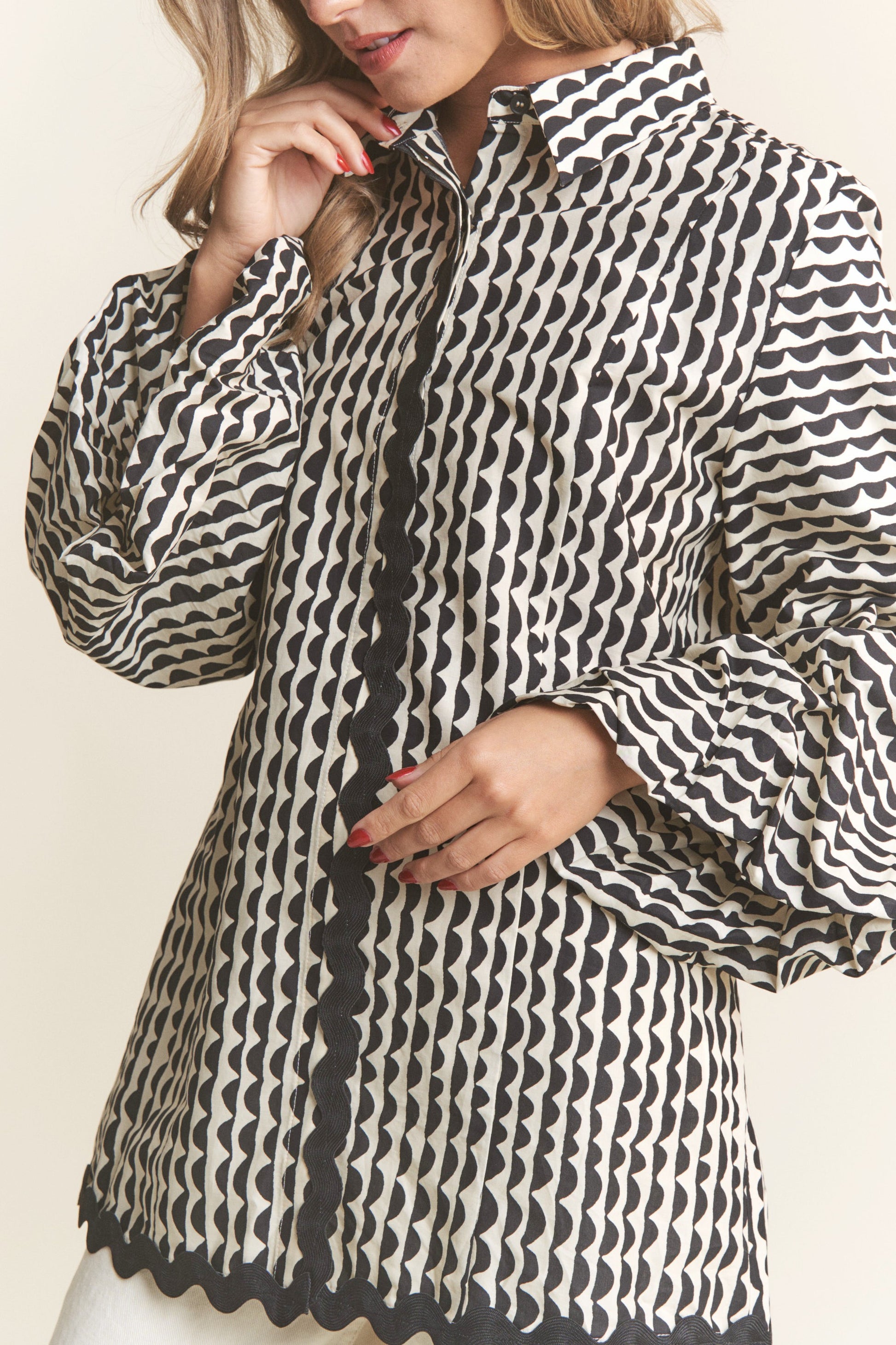 Geometric Pattern Wave Trimmed Balloon Sleeve Top.