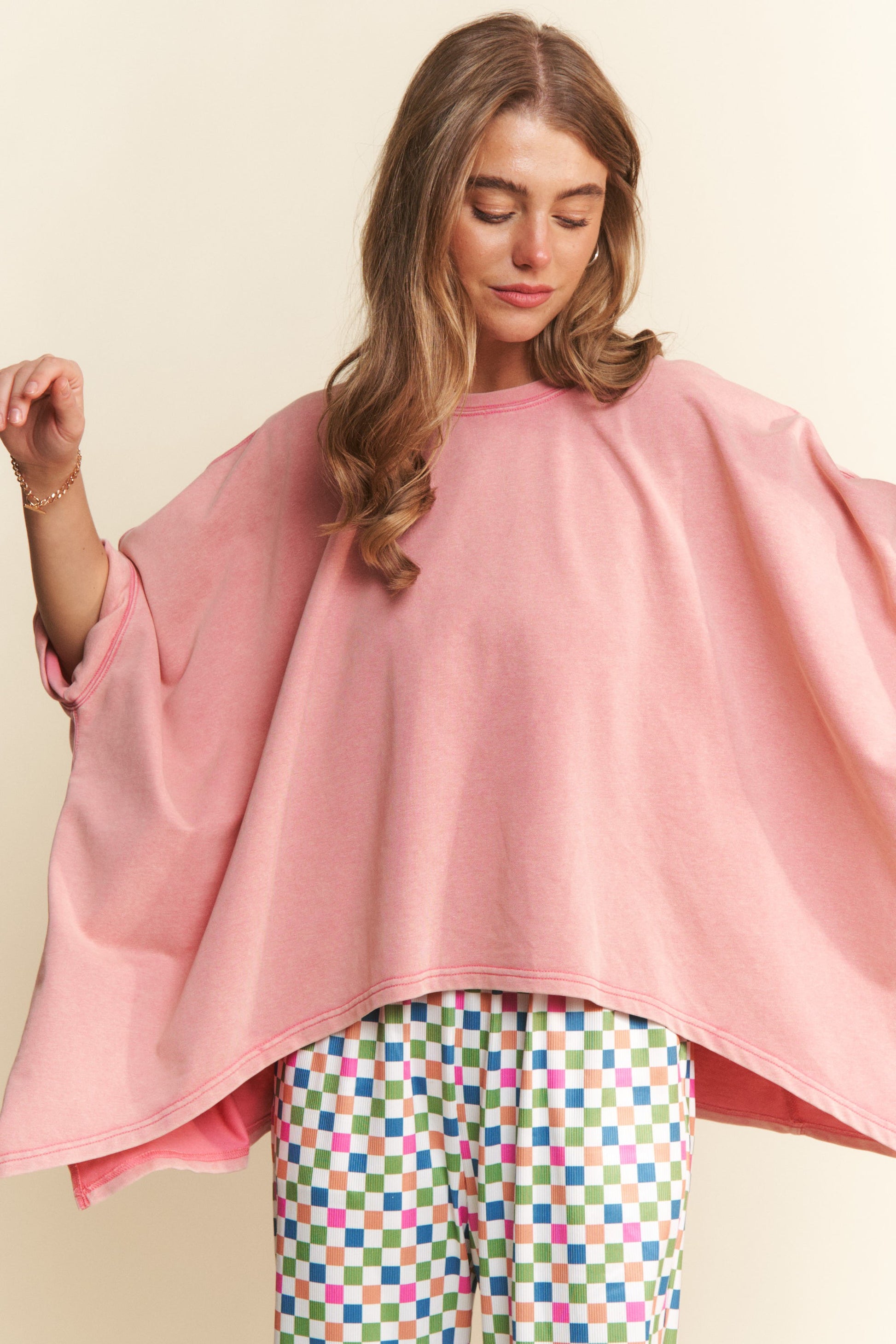 Dolman half-sleeve top, mineral-washed. Designed with pointed bottom hemline. Mineral wash fabric is created through a specialized dyeing and washing process that imparts a weathered and uneven color effect, reminiscent of well-loved, vintage garments.