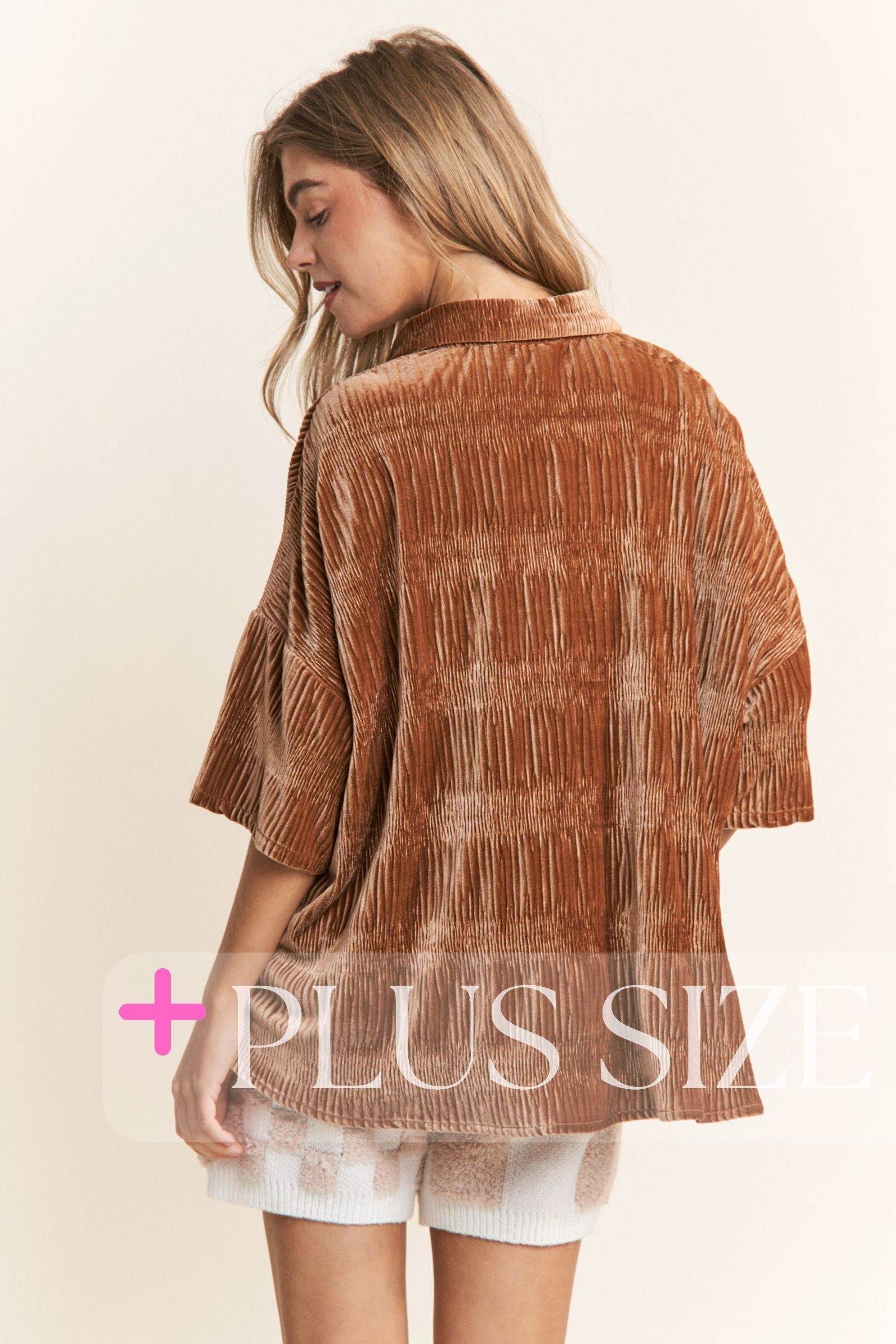 Women's plus size drop shoulder button down blouse. Ruched velvet stretchy fabric. Boxy body design